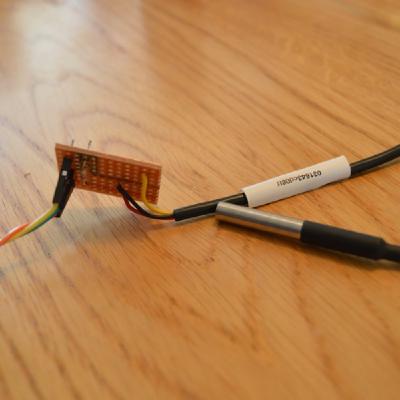 We took two temperature sensors and mounted them in a garden post with one pushed down to the bottom for soil temperature and one in the cap for the air temperature. The one-wire sensors can share the same three wires, so are both connected to a wire leading back to the Raspberry Pi through a hole drilled into the side of the post. For waterproofing we surrounded the whole with hot glue. The post is situated in a shady spot and pushed about 30 centimeters deep in the soil.