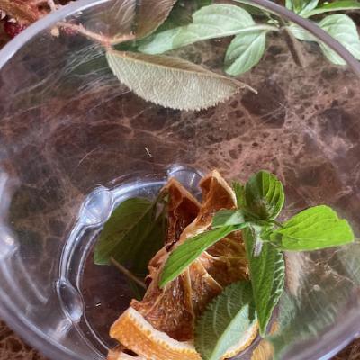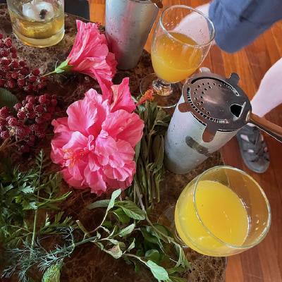 We then got to make our own cocktail from some of the items we'd gathered from the garden - first selecting the spirit and then crushing the leaves together with a caramelised orange segment. We then added these to a shaker with Guaro, syrup and ice and shook it. Diego smoked the glasses on a pine smoker, added ice and then we poured the cocktails in and garnished with more findings from the garden - in this case some flower petals and a carrot leaf.