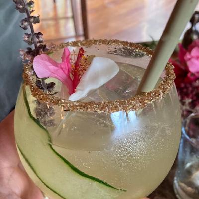 For the last cocktail we learnt how to garnish the rim of the glass and then could sit back and watch the expert at work in making the cocktails for us with cucumber and basil from the garden.